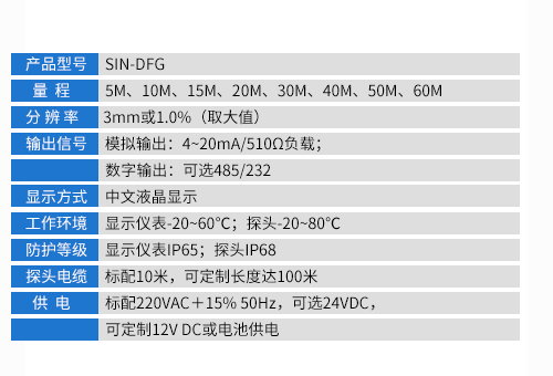 應用行業:SIN-DFG分體式超聲波液位計廣泛用于罐體、水池、水庫的液位和體積測量,也可用于明渠的流量測量。