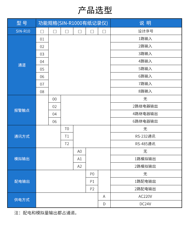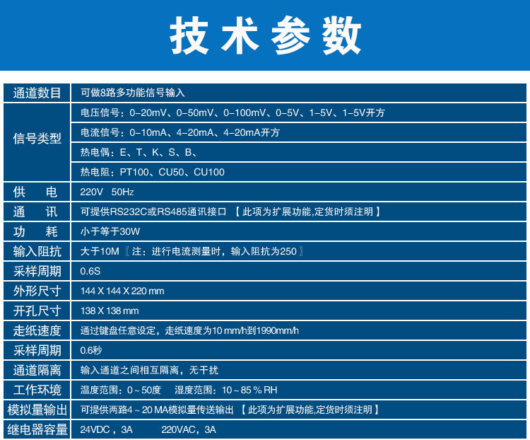 SIN-R1000有紙溫度記錄儀最多具有8路輸入通道,2路模擬量輸出,通道之間采用點點隔離;均可直接選擇接收多種熱電偶、熱電阻、壓力變送器、電壓、電流信號。